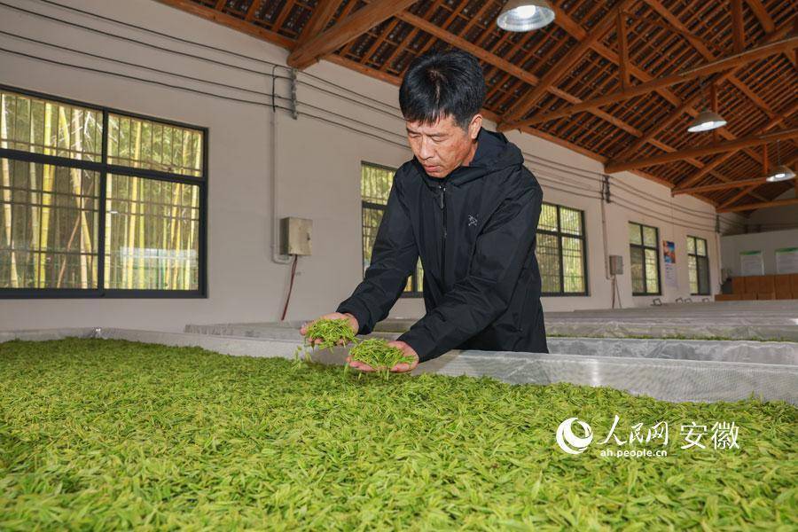 张启明在加工车间查看鲜叶摊晾情况。人民网记者 张俊摄